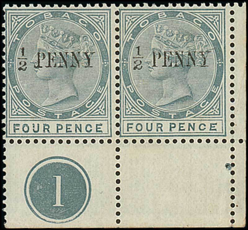 "½ penny" on 4d. grey lower right corner plate number pair, the right-hand stamp variety malformed "ce" in "pence", large part original gum; the variety with an inclusion. S.G. 30b, £354+. Photo