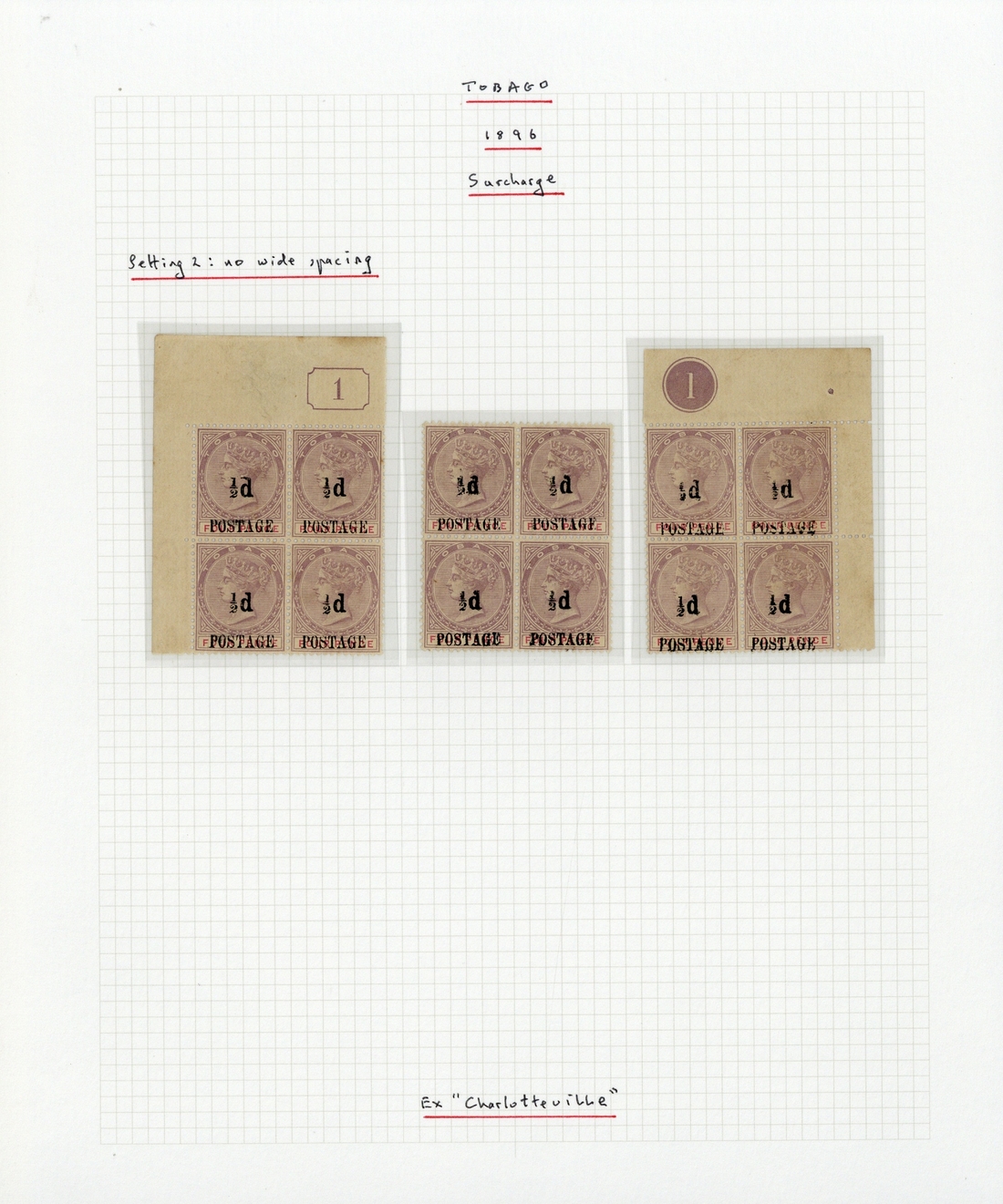 "½d/postage" on Fiscal 4d. lilac and carmine, three blocks of four with two from the corners of the pane showing current or plate number, from the rare setting 2 with no wide spacing variety, heavily toned gum, which is not unusual for these stamps, and the current number block with brown mark on the reverse of one stamp. S.G. 33, £1,200+