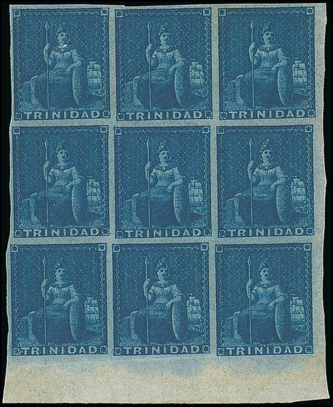 (1d.) deep blue marginal block of nine from the lower right corner of the sheet (right margin trimmed), fresh unused with large part original gum; fine. B.P.A. Certificate (2007). S.G. 4, £1,350. Photo