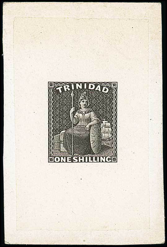 1/- in black on India paper (36x59mm.) on card (44x57mm.); very fine. Photo