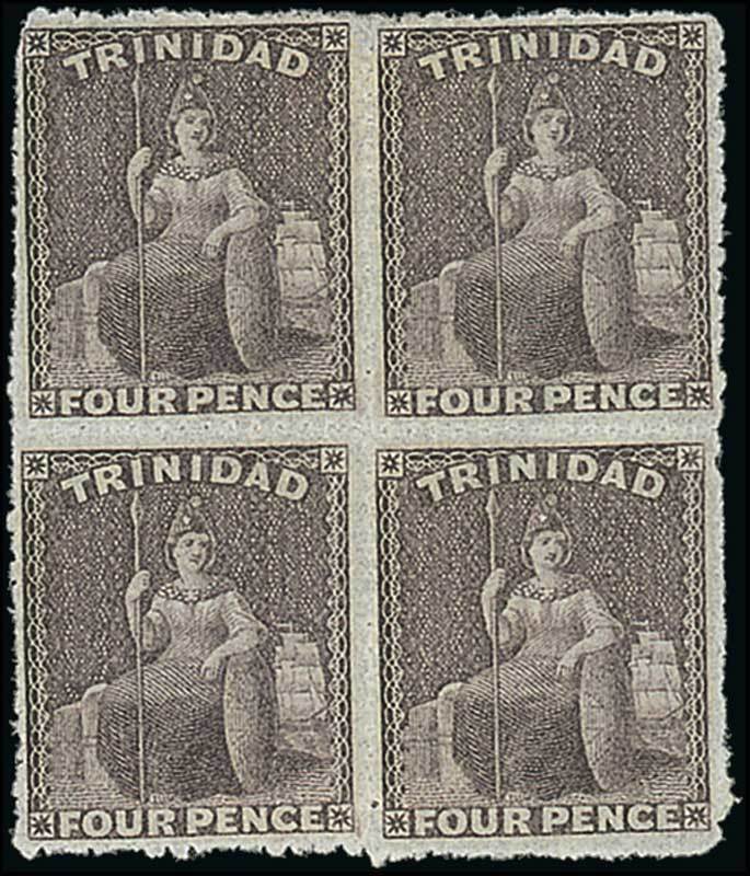 4d. brownish purple block of four of the remainder shade, large part original gum and brilliant fresh colour; fine and most attractive. B.P.A. Certificate (2007). S.G. 40a, £900+. Photo