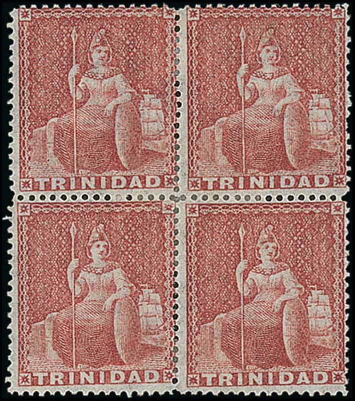 (1d.) rose-red block of four, large part original gum and good colour; central perfs. re-inforced. A very scarce multiple. B.P.A. Certificate (2007). S.G. 46, £760+. Photo