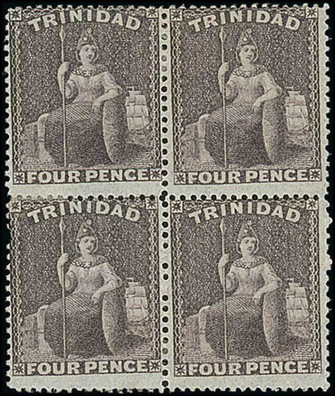 4d. brownish lilac block of four with large part original gum, fresh colour; fine and scarce multiple. B.P.A. Certificate (2007). S.G. 47, £800+. Photo
