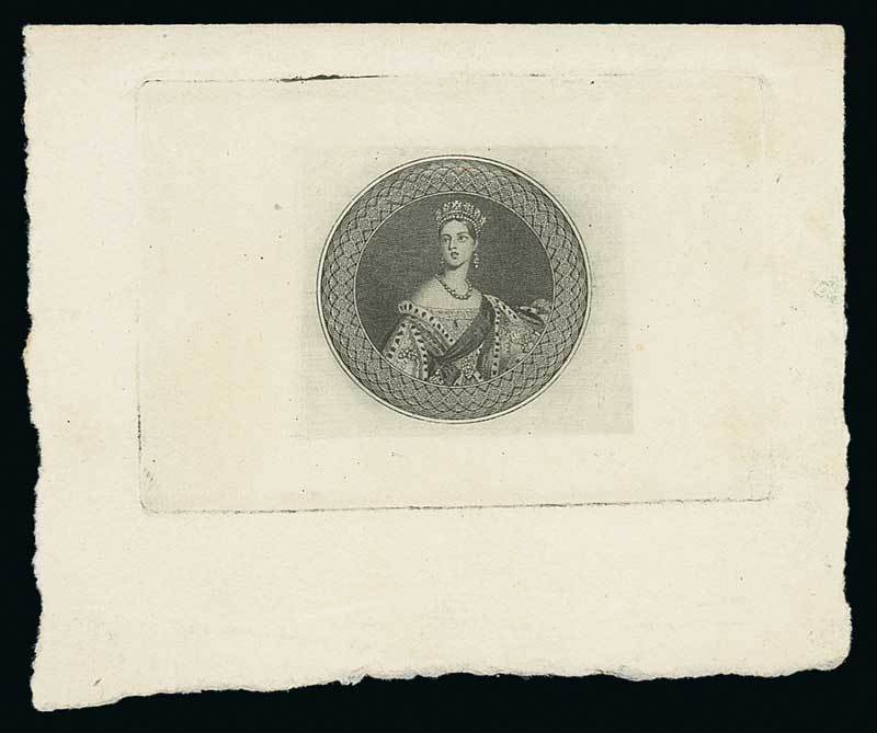 The original essay prepared by Perkins, Bacon & Co. Ltd., showing Chalon half-length portrait engraved by William Humphrys with engine-turned background and ornamental circular surround, State 2 with circular frame-line dividing the portrait from the engine-turned background, in black on surfaced wove paper (97x78mm.). Rare and highly attractive. R.P.S. Certificate (2007). Photo