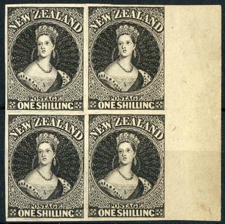 1855 1/- block of four with sheet margin at right, in black on wove paper, fine