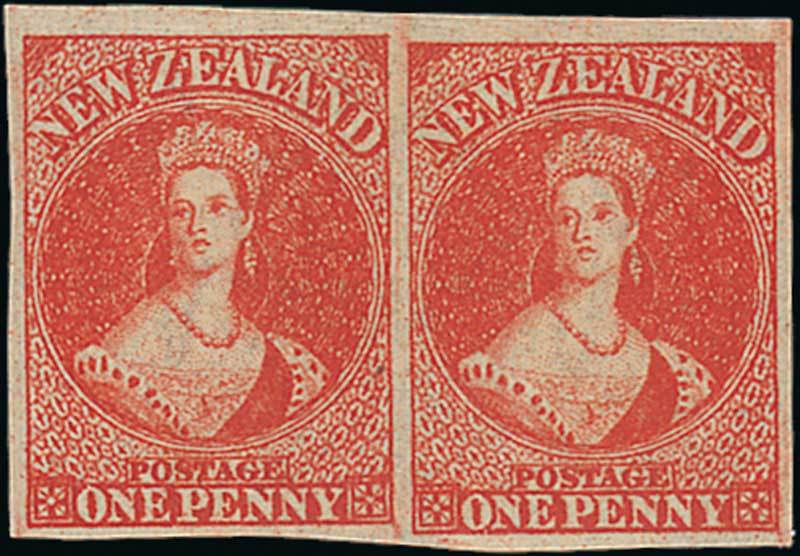 1d. carmine-vermilion horizontal pair with large to very large margins, unused with large part original gum, diagonal gum creases at upper right. A fine and beautiful looking pair. B.P.A. Certificate (2006). C.P. A1e(4), $2,000; S.G. 35, £900. Photo