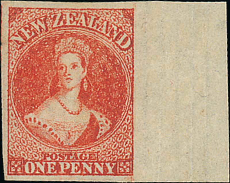 1d. carmine-vermilion with large sheet margin at right, unused with large part original gum. A fine and most impressive looking stamp. C.P. A1e(4), $1,000; S.G. 35, £450. Photo