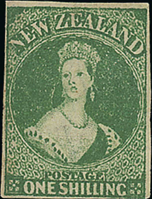 1/- yellow-green with mainly small to large margins (cut close at bottom right), unused without gum, fine. Odenweller Certificate (2006). C.P. A6d(3), $4,000; S.G. 45, £1,600. Photo