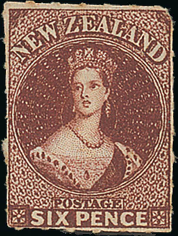 6d. red-brown with roulettes or traces thereof on all sides, fresh unused with part original gum; vertical crease and upper right corner fractionally rounded, otherwise with design intact. A rare stamp. R.P.S. Certificate (1971). C.P. A5b(V), $4,500; S.G. 55, £3,250. Photo