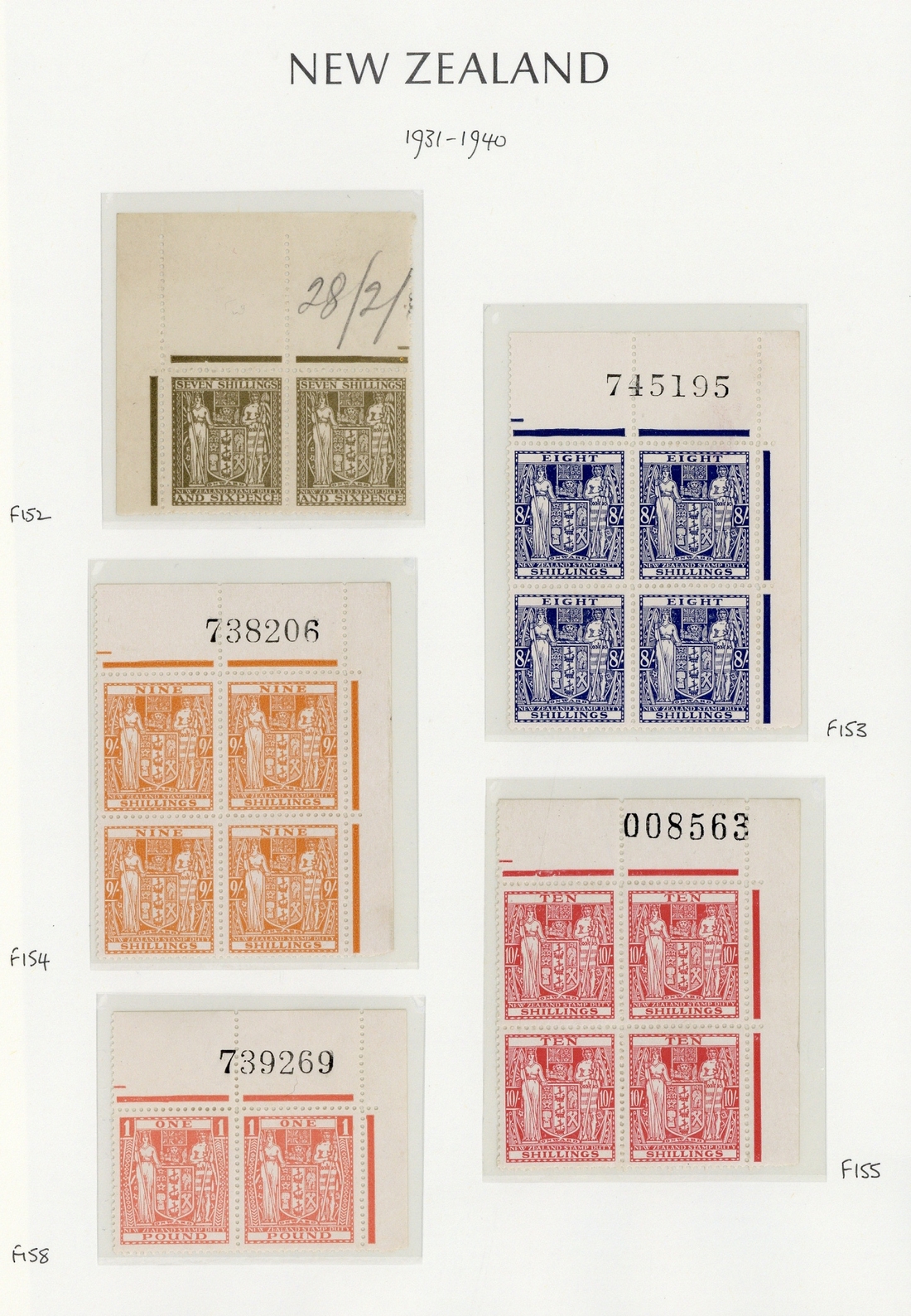 4/-, 5/-, 6/-, 7/-, 8/-, 9/- and 10/- in top right corner blocks of four with sheet number, 7/6d. top left corner pair and £1 top right corner pair with sheet number, fine unmounted mint. C.P. Cat. $4,340; S.G. Cat. £1,132