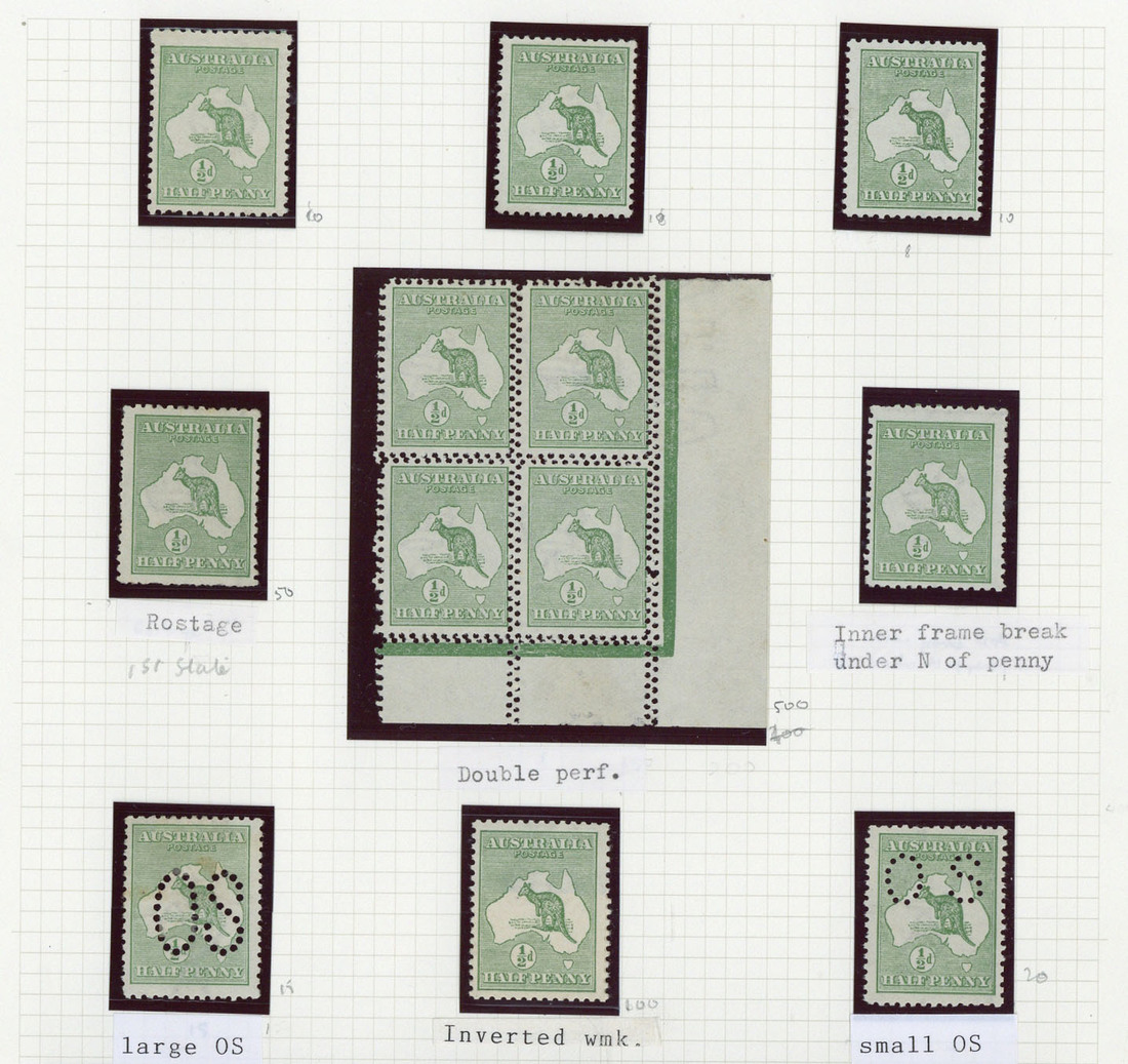 ½d. green lower right corner block of four with all lines of perforation double, and eight singles, one with watermark inverted, one showing variety "rostage", one perforated large "OS" and one perforated small "OS", fine mint. BW cat. $1500+