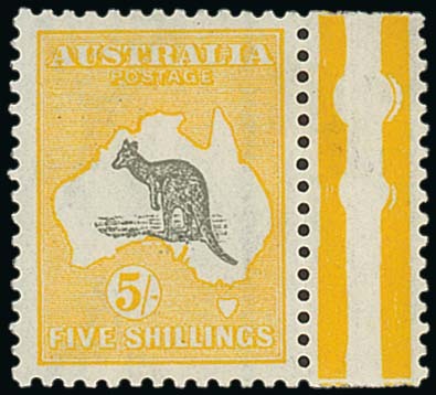 5/- grey and yellow with interpanneau margin at right, fresh and fine mint. S.G. 30, £1000. Photo