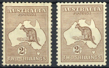 2/- brown, two examples in slightly different shades, one very slightly toned otherwise fine mint. S.G. 41, £500