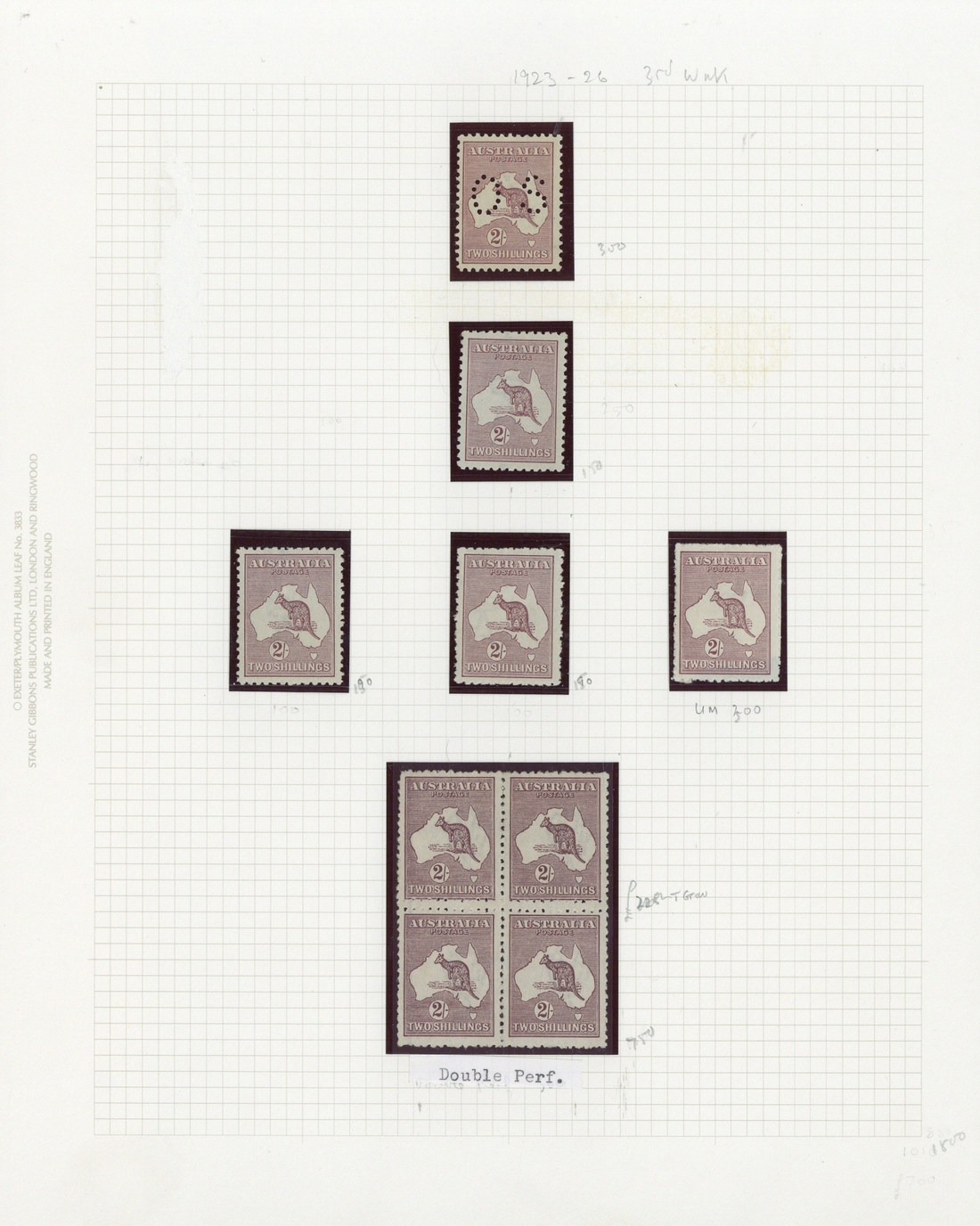 2/- maroon block of four with central horizontal perfs double and singles (5, one perf "OS"), fine. S.G. 74; BW 38, $3250