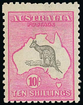 10/- grey and bright aniline pink showing kangaroo's foot broken and pointed tail, centred to foot and slightly gum toned, otherwise fine mint. S.G. 43a, £500; BW 48(V)n, $1750. Photo