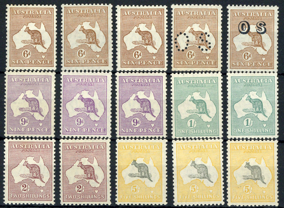 6d. (5, one perf "OS" and one overprinted "OS"), 9d. (3), 1/- (2), 2/- (2) and 5/- (3, one showing white flaw on kangaroo's leg), some with hinge remnants and one 5/- with short perf at foot, fine mint. S.G. 107-111, £1325