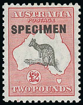 10/- grey and pink (3) overprinted "specimen" showing Types C, C1 and C2 (a little gum toned), and £2 black and rose overprinted "specimen" with Type D, fine mint. S.G. 112s, 1142; BW 49x, 49xb, 49xd, 57x, $4775. Photo