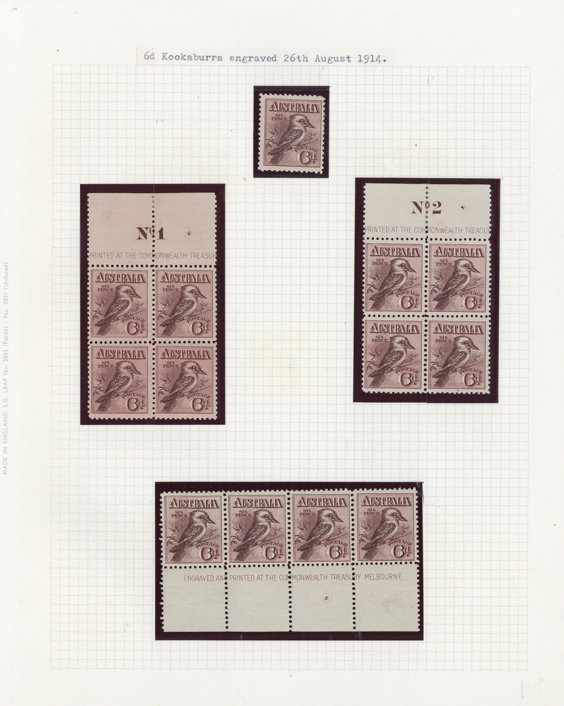 Two top marginal blocks of four showing Plate Nos. 1 and 2, a bottom marginal strip of four with imprint and singles (3, one with weak entry to inner frame line), fine mint