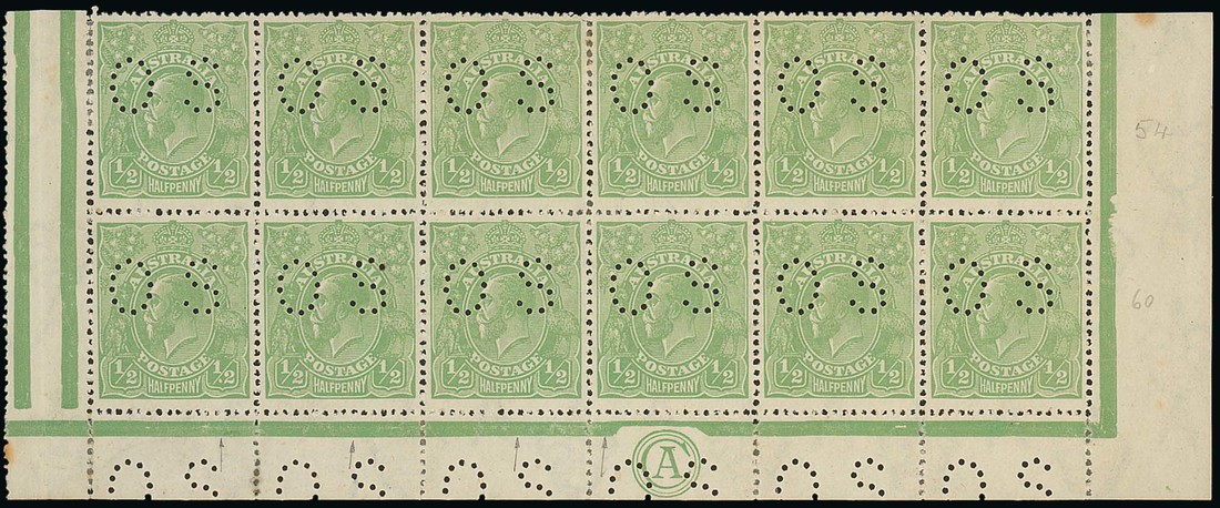 ½d. green, large multiple watermark, Electro 4, a block of twenty-four being the bottom two rows of the sheet split into two blocks of twelve, showing "CA" monogram both sides, all perforated "OS", a few re-inforced perfs otherwise fine mint. Very rare, approximately twenty strips of twelve have survived. S.G. 48; BW 65(4)zf, $3000. Photo