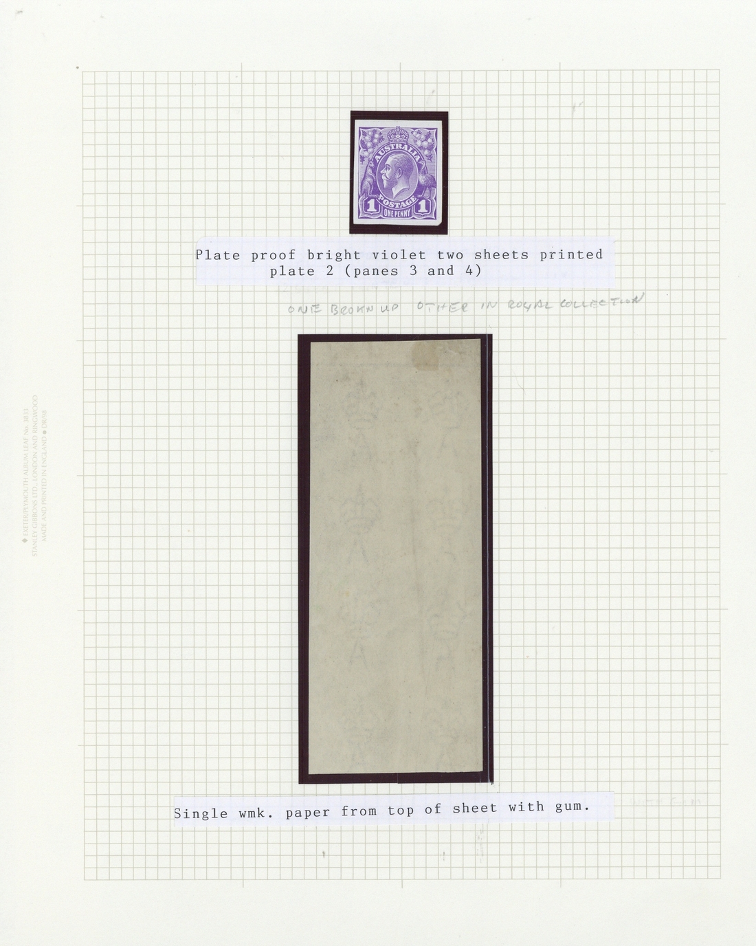 1d. imperforate plate proof in bright violet on thin glazed card, fine; also a piece of gummed paper showing eight (2x4) impressions of the single watermark, a fraction soiled