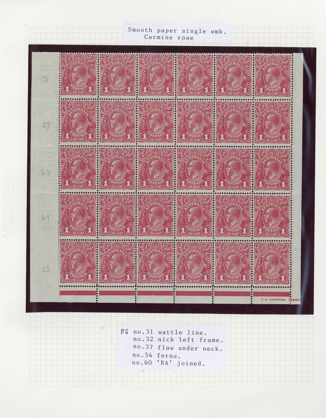 1d. carmine-red (shades), single watermark, comb perf 14, Die I, a mint study comprising lower left corner block of thirty with part Harrison imprint, corner block of six perf "OS" with four Die II, block of five with "CA" monogram), blocks of four (2, one with watermark inverted), pairs (2, one with watermark inverted) and singles (64, nine with watermark inverted, one marginal with perfs double at foot, three perf "OS" including one in pale terra cotta shade and three used including one with substituted cliché), a good range of shades and some with flaws identified including flaw under neck and "RA" joined, condition generally fine