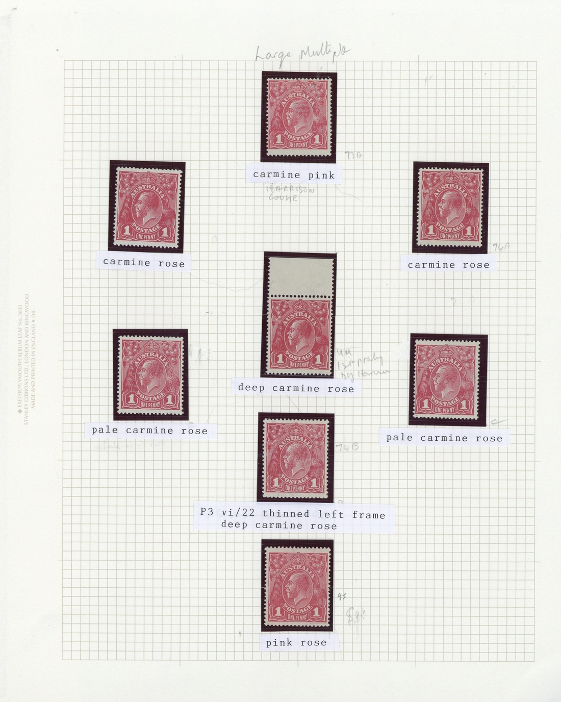 1d. carmine-pink, large multiple watermark, a block of twelve and ten singles in a good range of shades including one stated to be carmine-pink, one with "ra" joined, fine mint. S.G. 49-50, £1000+; BW 73-74