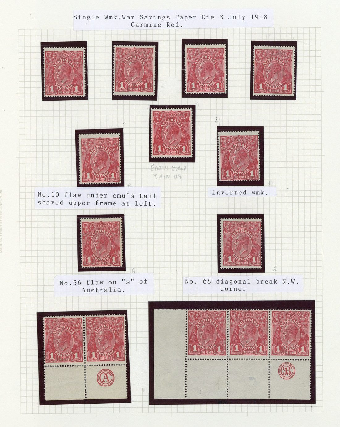1d. rose-red, single watermark, War Savings paper, a mint range comprising a block of four, lower left corner strip of three with "JBC" monogram (hinge remnants and thin in margin), pair with "CA" monogram and singles (16, one with "JBC" monogram and one with watermark inverted), good range of shades, mostly fine. S.G. 53; BW 75, $5800+