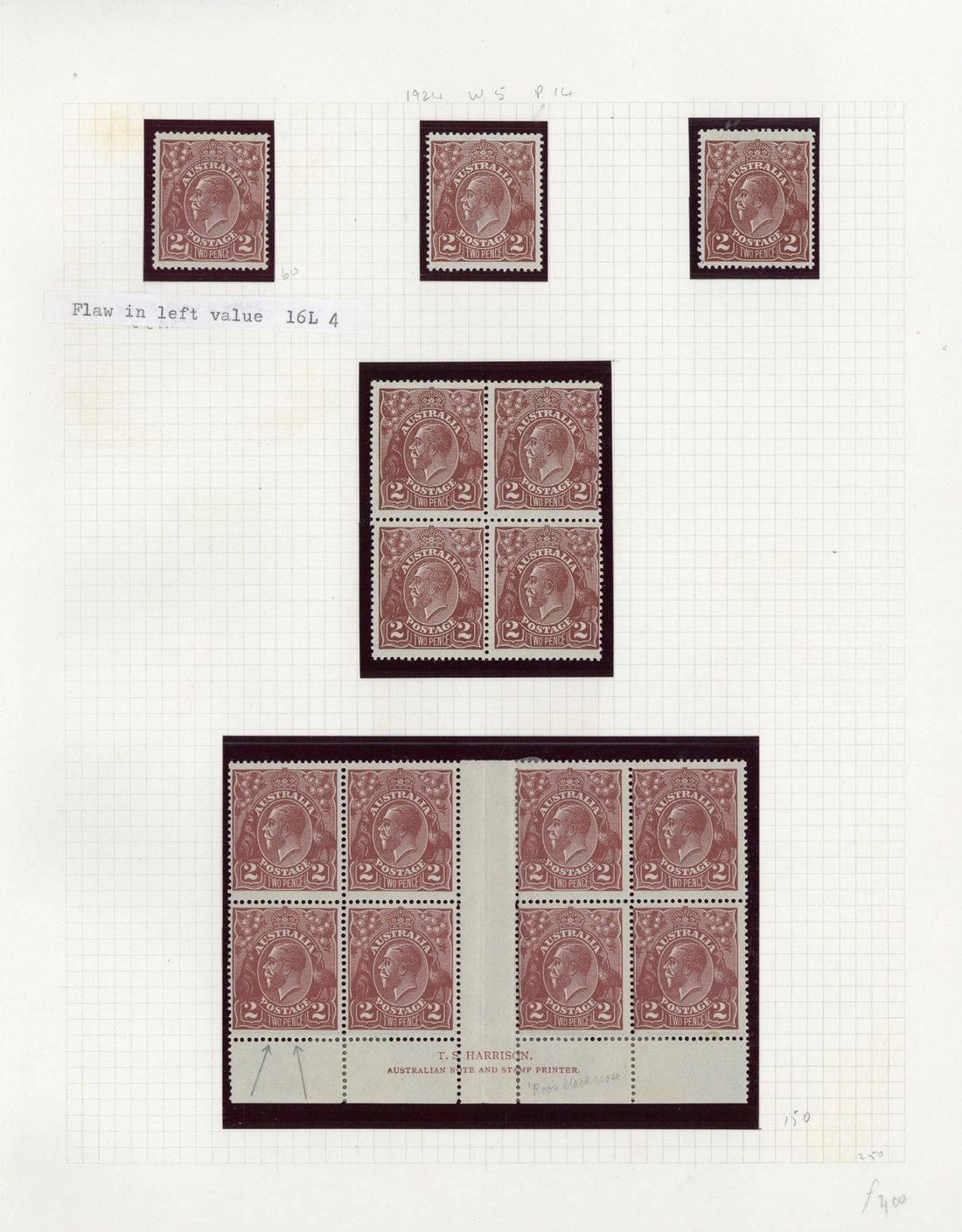 2d. red-brown, single watermark, block of eight with Harrison imprint, block of four and singles (3); small multiple watermark, perf 14 blocks of four (2), pair with Mullett imprint and a single, perf 13½x12½ singles (2); 2d. scarlet, small multiple watermark, perf 13½x12½, Die II block of four with Ash imprint and singles (6, one overprinted "OS") and Die III block of four with Ash imprint, pairs (2, one with Ash imprint) and singles (8, two overprinted "OS"); and 2d. scarlet, C of A watermark, block of four with Ash imprint and a corner pair; mostly fine