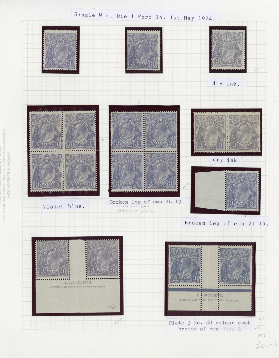 3d. dull ultramarine, single watermark, blocks of four (2), pairs (3, one with Harrison imprint and one with Mullett imprint), pair (dry ink) and singles (4, one dry ink); small multiple watermark, perf 14 pairs (2) and singles (4, two perf "OS"), perf 13½x12½ blocks of four (2, one with Types A and B), corner strip of three with partial offset, pairs (2, one with Ash imprint and the other perf "OS") and singles (6, two Die II, one perf "OS" and one showing "bonnet" on emu); and C of A watermark Ash imprint block of four, corner strip of three and singles (3); many with plate flaws identified, generally fine mint. BW cat. $4,300+