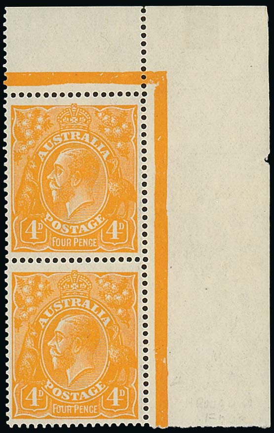 4d. orange, single watermark, an upper right corner vertical pair, the lower stamp with line through "fourpence", fine unmounted mint. S.G. 22/e, £325+; BW 110r, $700+. Photo