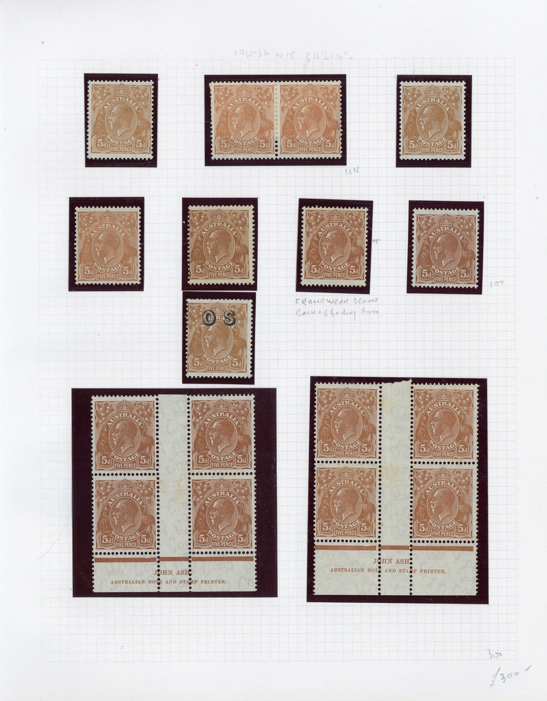 5d. brown, small multiple watermark, perf 13½x12½, block of four with Ash imprint and singles (4), and C of A watermark blocks of four (2, both with Ash imprint, pairs (4) and singles (7, one overprinted "OS"); mostly fine mint. BW cat $1800+