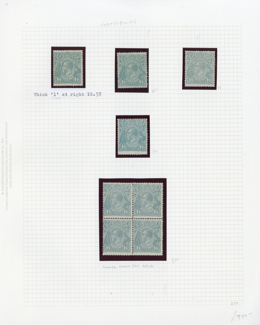 1/4d. pale blue, single watermark, block of four and singles (4, one showing thick "1" at right), and small multiple watermark, perf 13½x12½ pair with Ash imprint and a single; fine mint. BW cat. $3300+