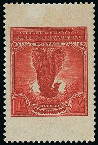 1932 1/- Lyrebird Chambon perforated printer's sample, in bright red on gummed unwatermarked white wove paper, fine. BW 145PP(1)A, $1000. Photo