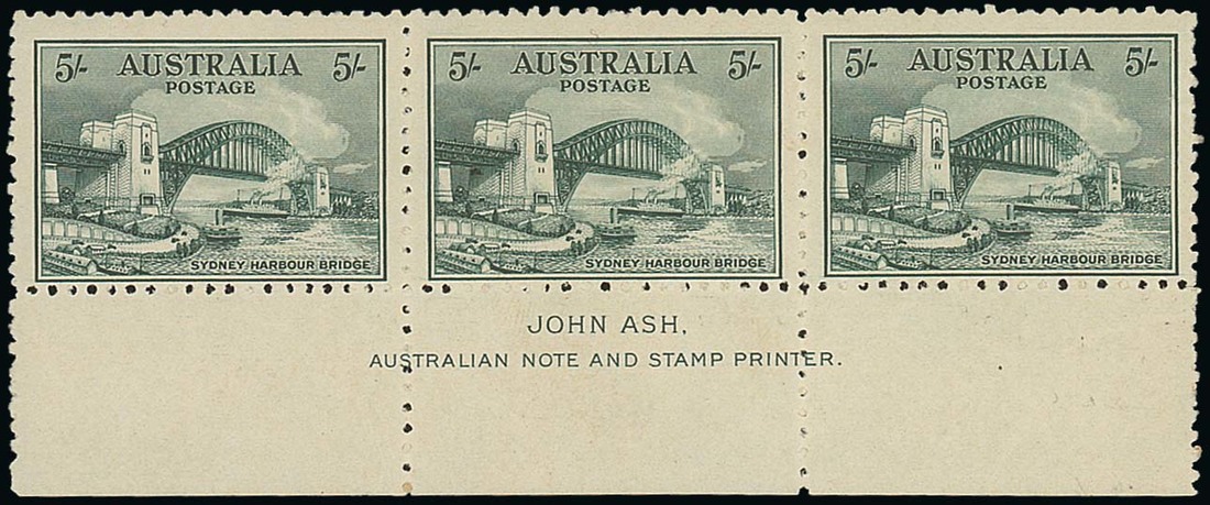 1932 Bridge 5/- blue-green, an imprint strip of three, fine mint. S.G. 143; BW 148zf, $3000. Photo