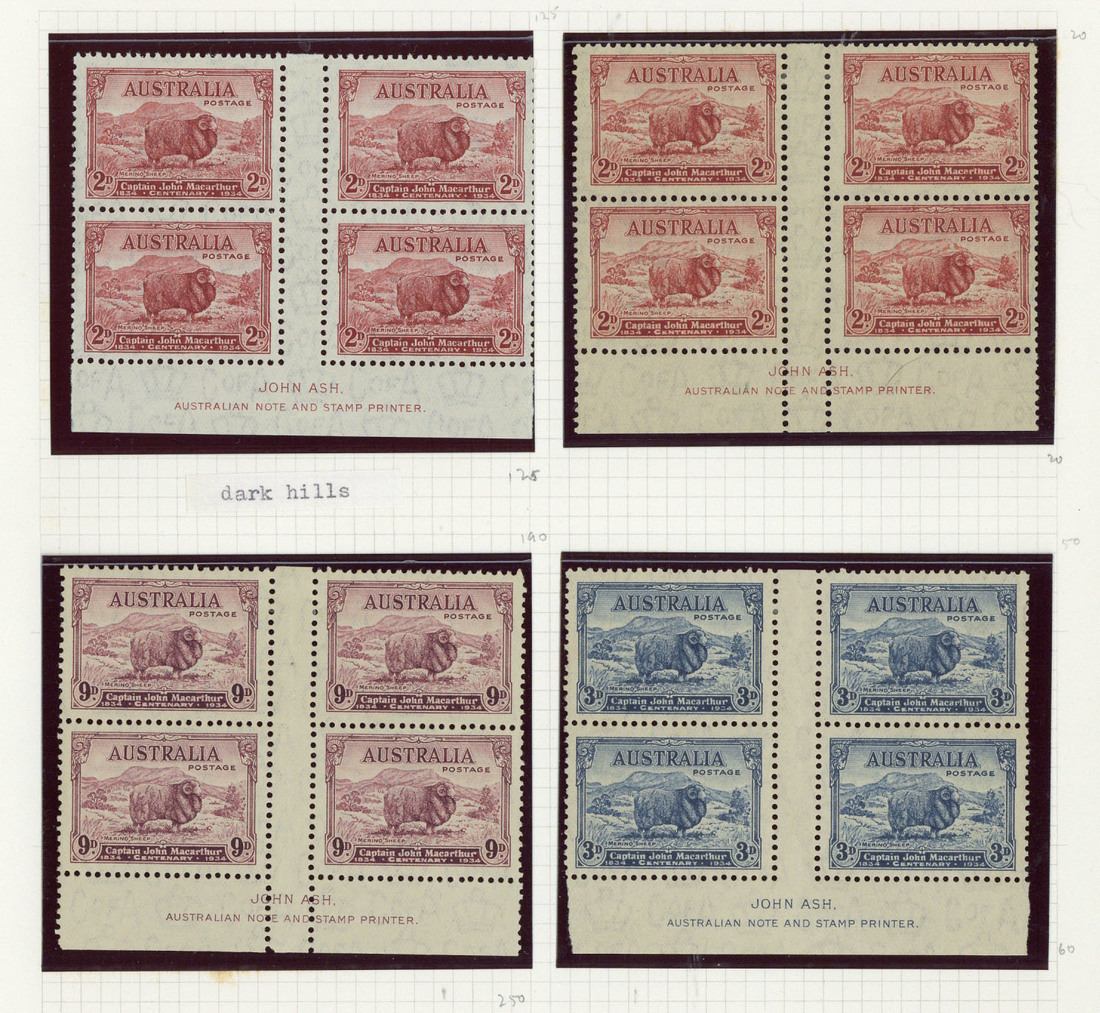 1934 Macarthur 2d. (both), 3d. and 6d. imprint blocks of four, fine mint. S.G. 150-152; BW 157z-160z, $640