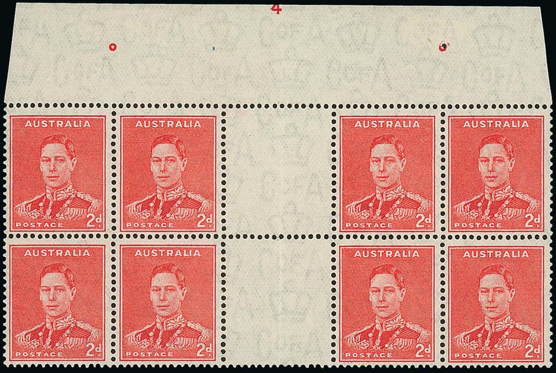2d. scarlet, perf 15x14, a top centre plate number "4" gutter block of eight, fine, mounted in the selvedge only. S.G. 184; BW 188zc, $2500. Photo