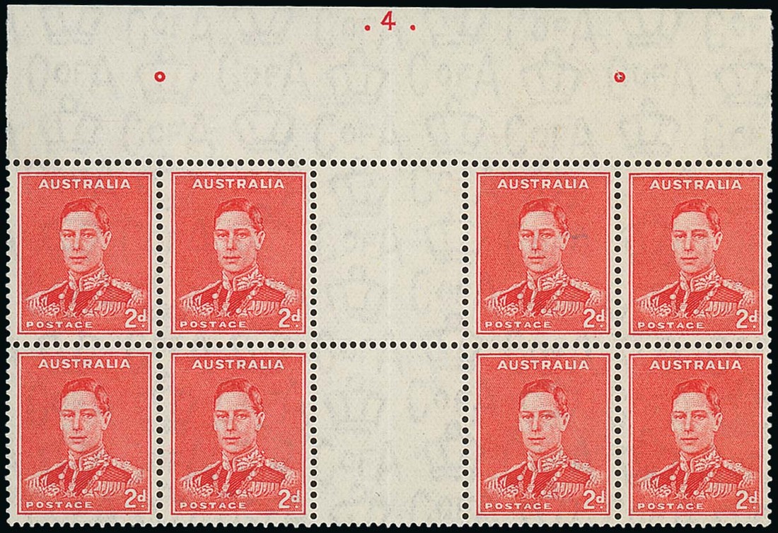 2d. scarlet, perf 15x14, a top centre plate number "4" with dots gutter block of eight, fine unmounted mint. S.G. 184; BW 188zca, $2500. Photo
