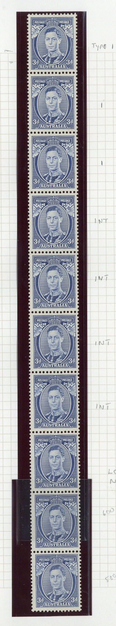 3d. blue, perf 13½x14, Die I 1st printing "white wattles", a vertical strop of ten showing a gradual separation of "ta", the rows 1-3 the letters are joined, rows 4-7 showing a gradual separation, and rows 8-10 the letters are separated, fine mint. S.G. 168a, £1160