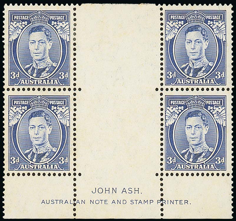 3d. blue, perf 13½x14, Die I 1st printing "white wattles", an Ash imprint block of four, fine mint. S.G. 168a; BW 190za, $1500. Photo