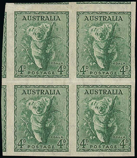 4d. green block of four, perf 15x14, variety imperforate, some light creases otherwise fine mint. BW 198b, $2000. Photo