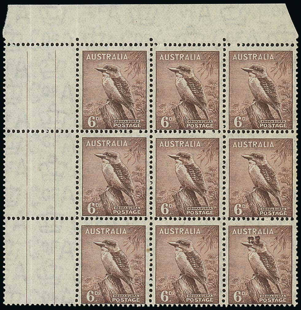 6d. purple-brown, perf 15x14, a corner block of nine with interpanneau margin at left, the lower right stamp showing "Top Hat" flaw, fine unmounted mint. Rare and spectacular. S.G. 190ab, £1000; BW 203o, $2500. Photo