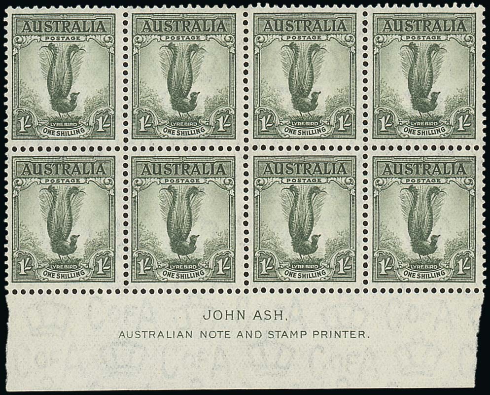 1/- grey-green, perf 13½x14, a block of eight with Ash centre imprint, fine unmounted mint. S.G. 174; BW 208zc, $1000. Photo