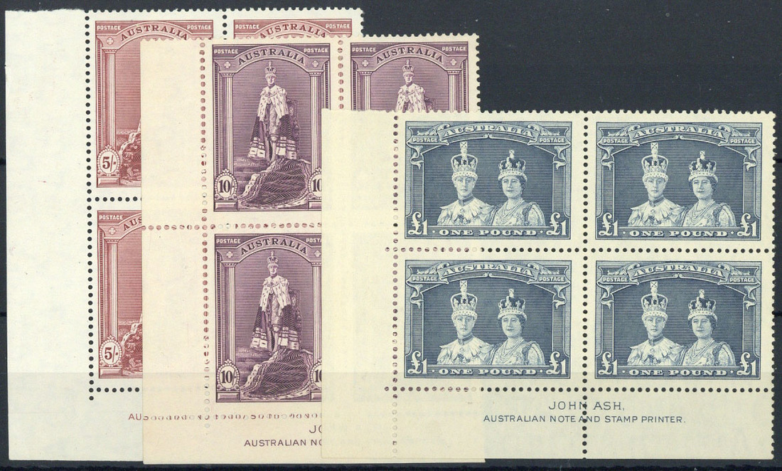 5/-claret, 10/- dull purple and £1 bluish slate on chalk-surfaced paper, each in an Ash imprint corner block of four, fine mint. S.G. 176-178; BW 212z, 214z216z, $740