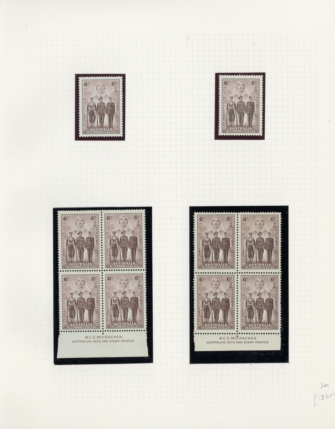 1940 Forces 1d. blocks of twenty (light stains) and four (3, two with imprint and one showing broken rifle butt), lower right corner strip of three showing broken wings on airman), a pair showing broken rifle butt) and singles (2), 2d. imprint blocks of four (3) imprint pair and singles (2), 3d. imprint blocks of four (2, one plate flaw) and singles (2), and 9d. imprint blocks of four (2); mostly fine mint. S.G. 196-199; BW 218-221, $700+