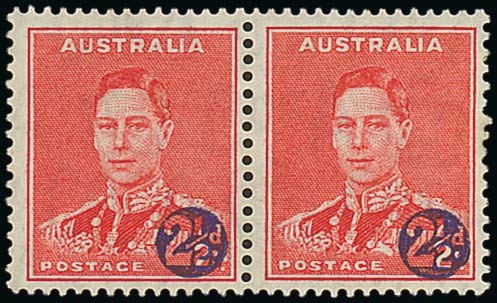 1941 2½d. on 2d. scarlet pair, the right stamp showing "Medallion" flaw, fine mint. S.G. 200b, £375; BW 222d, $325. Photo