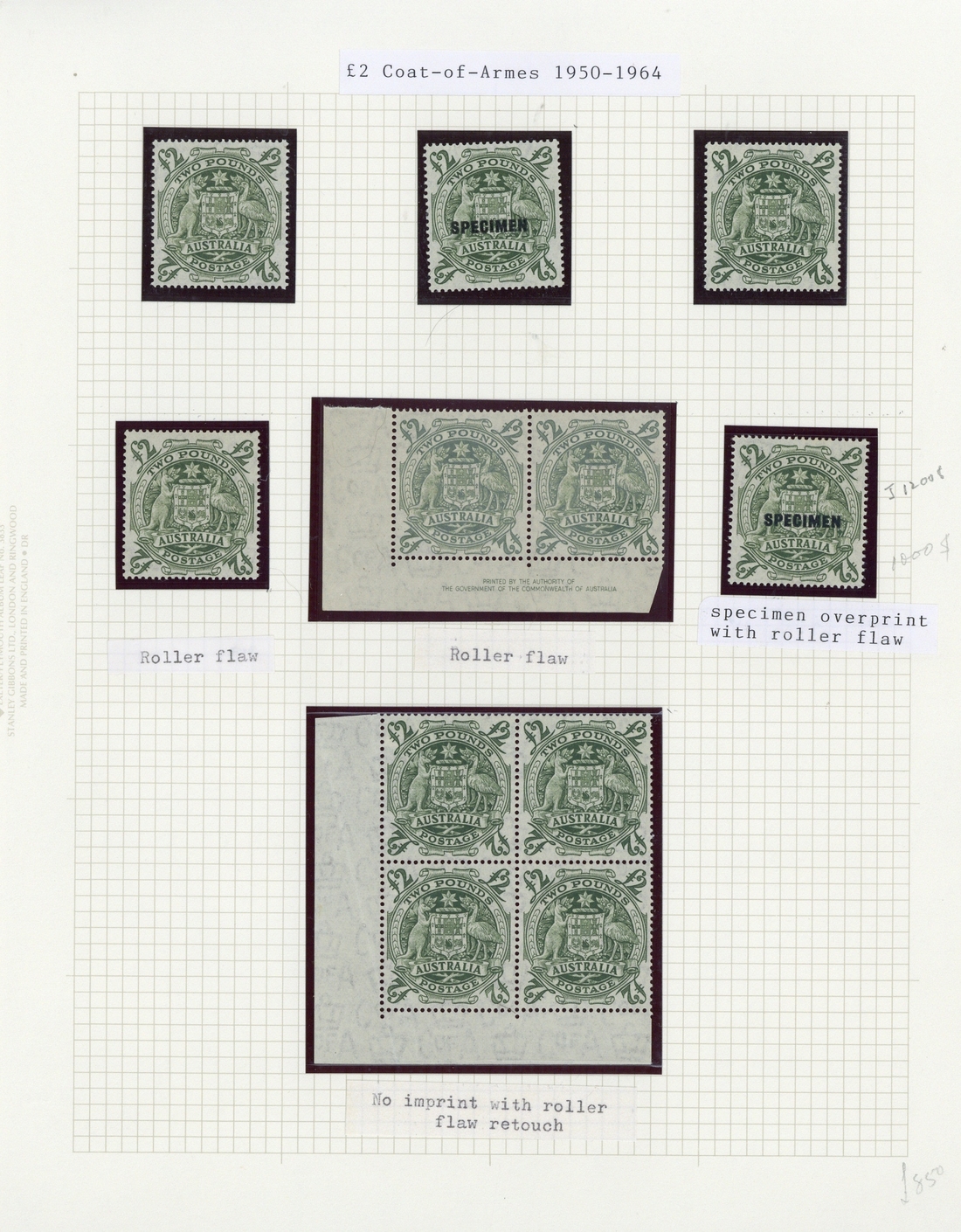 1948-51 Arms 5/- lower left corner blocks of four (3, one with By Authority imprint and two without imprint, one on thin paper) and a single, 10/- lower left corner blocks of four (2, one with By Authority imprint and one without imprint) and singles (2, one overprinted "specimen"), £1 lower left corner blocks of four (2, one with By Authority imprint and one without imprint) and singles (2, one overprinted "specimen") and £2 lower left corner block of four without imprint and retouched roller flaw, lower left corner pair with By Authority imprint and showing roller flaw and singles (5, two overprinted "specimen" - one with roller flaw, and another with roller flaw), mostly fine mint. S.G. 224a-224d; BW 268-271, $5,000+