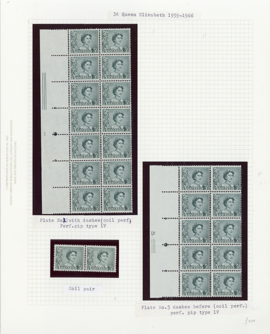 1959-63 QE 3d. blue-green, block of fourteen with margin at left showing Plate number 3 with dashes above, blocks of twelve (2) with margin at right showing Plate number 3 with dashes above and below, and blocks of ten and eight with margin at left showing Plate number 5 with dashes below and above respectively, fine unmounted mint. S.G. 311; BW 350, $1,500