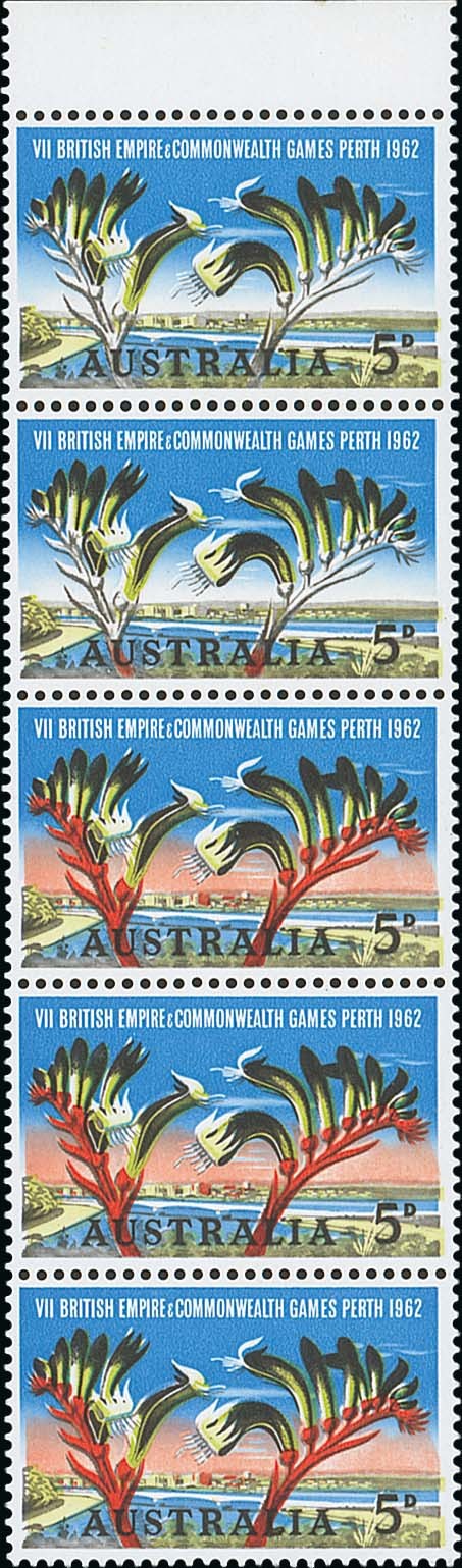 1962 (Nov.) Games, 5d. vertical strip of five from the top of the sheet, the top row with red completely omitted and the second with large part red omitted, fine mint, mounted in the selvedge only. Rare, only ten possible. S.G. 346a, £5,500; BW 390c, $6,000. Photo