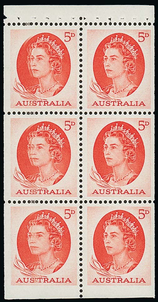 1963-65 QE 5d. red, a complete booklet pane printed with ordinary (non-helicon) ink, fine unmounted mint. Very rare. BW 403aa, $1000. Photo