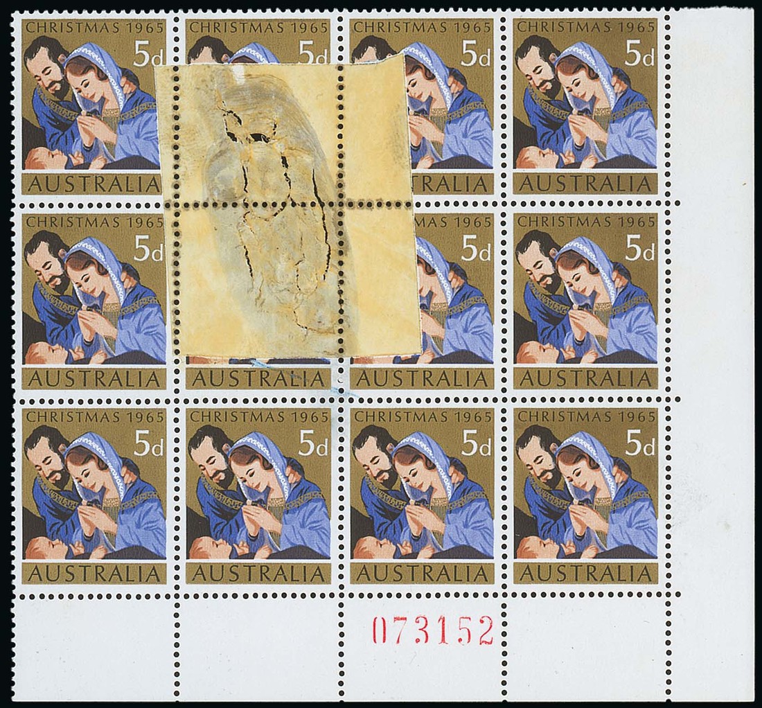 1965 (Oct.) Christmas 5d., a lower right corner block twelve (4x3) with serial number "073152" at foot showing a large area affecting six stamps where a piece of paper interrupted the printing causing a blank space, also the said piece of paper. A most spectacular printing error. S.G. 381. Photo